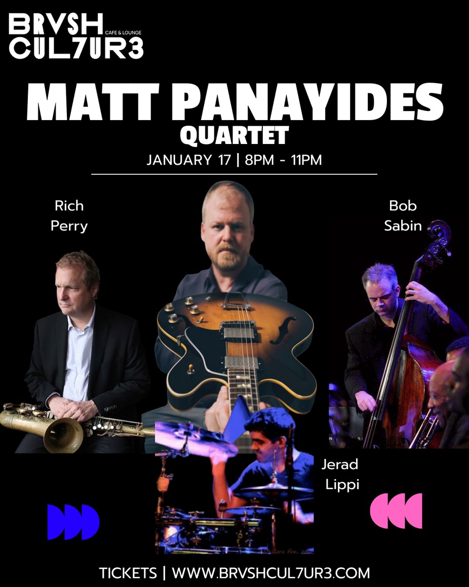 Prepare for an extraordinary evening of jazz as Matt Panayides Quarter takes the stage with saxophone legend Rich Perry, acclaimed bassist Bob Sabin, and dynamic drummer Jerad Lippi! 🎸🎷 This all-star quartet showcases the lyrical depth and adventurous spirit of Panayides’ original compositions alongside compelling group interplay and virtuoso soloing — a night of inspired improvisation you won’t want to miss. Whether you’re a longtime jazz lover or discovering this music for the first time, expect a rich blend of melodic invention, rhythmic drive, and unforgettable musical moments.
